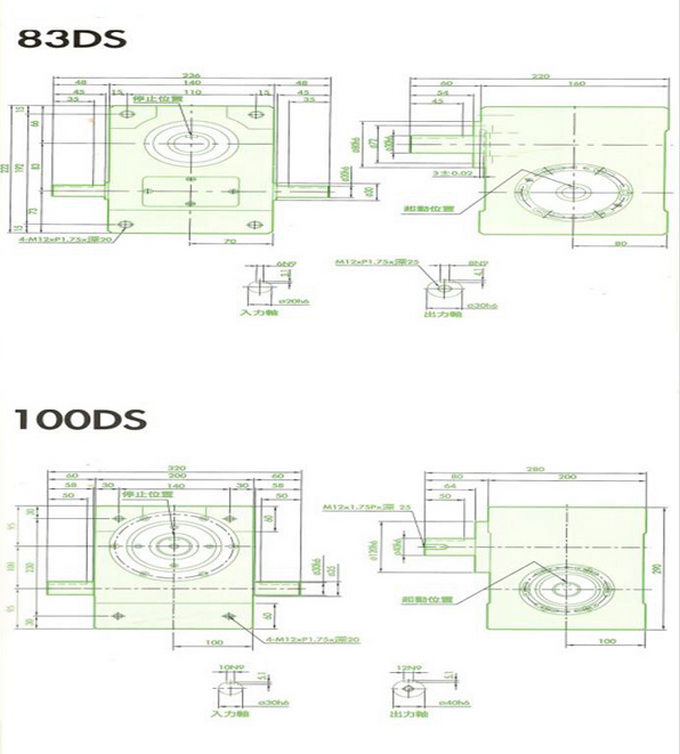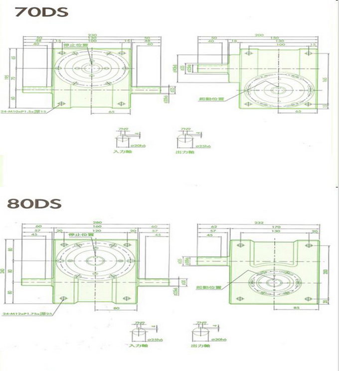 心轴型凸轮间歇分割器:此系列机种为典型传统心轴造型,其安装配件之加工安装配合齿轮、联轴或联轴盘,需特别注意孔径公差(+0.015/-0)及键槽公差(+0.015/-0),其使用场合在输送带驱动、齿轮驱动、无间隙联轴器结合驱动居多。 心轴型凸轮间歇分割器的规格型号有:心轴型45DS,心轴型60DS,心轴型70DS,心轴型80DS,心轴型83DS心轴型, 100DS,心轴型110DS心轴型,125DS心轴型,140DS心轴型150DS,心轴型180DS,心轴型200DS