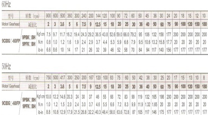 2、选型表中有颜色部分的型号为韩国国内(60Hz)用电机。